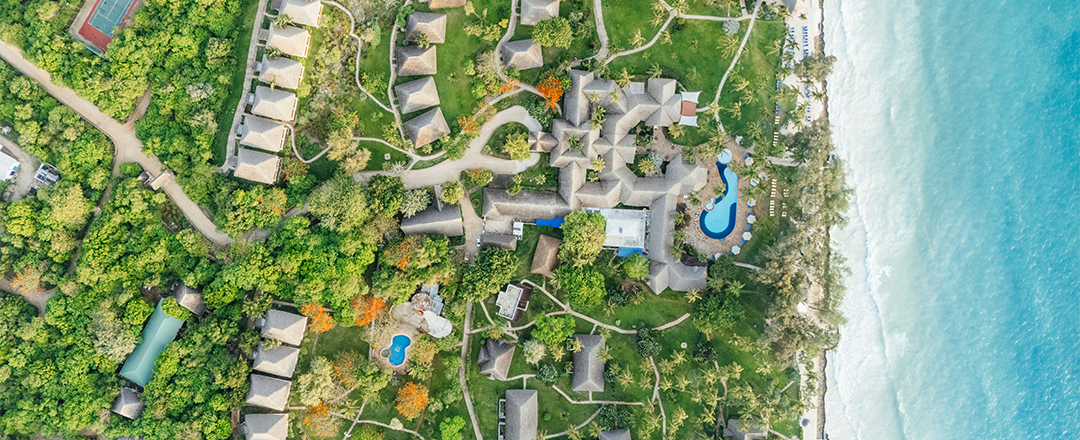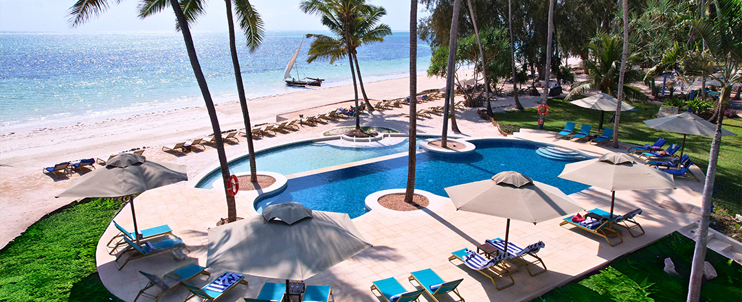 Situé à 1 heure de route de l'aéroport international, l'hôtel Bluebay Beach Resort & Spa est placé sur la plage de Kiwenga, sur la côte Est de l'île, au mileu de jardins tropicaux et d'une cocoteraie.